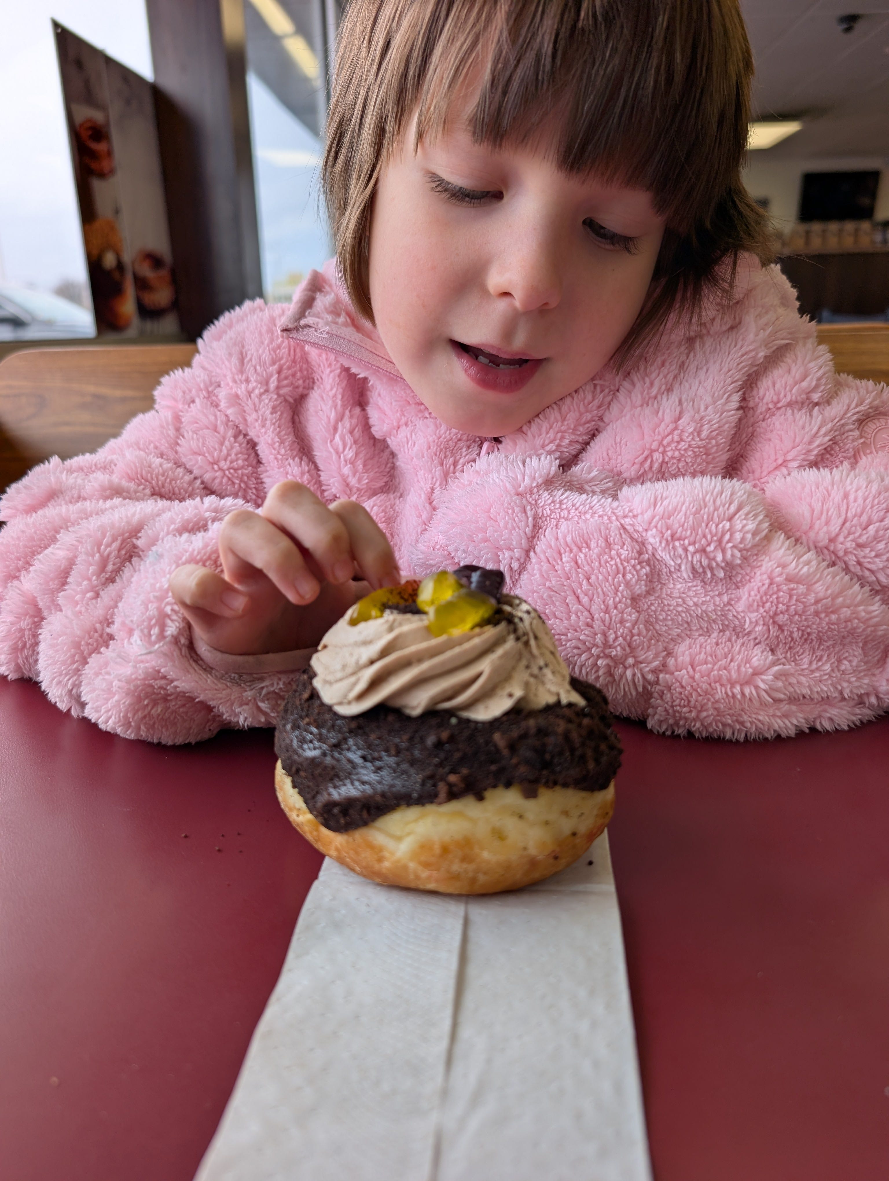 The plan was to stay away from the donut shop because she’s had a fair bit of sweets the past few days, but we had to run an errand and figured well, seeing as how we are in the area - what the heck.