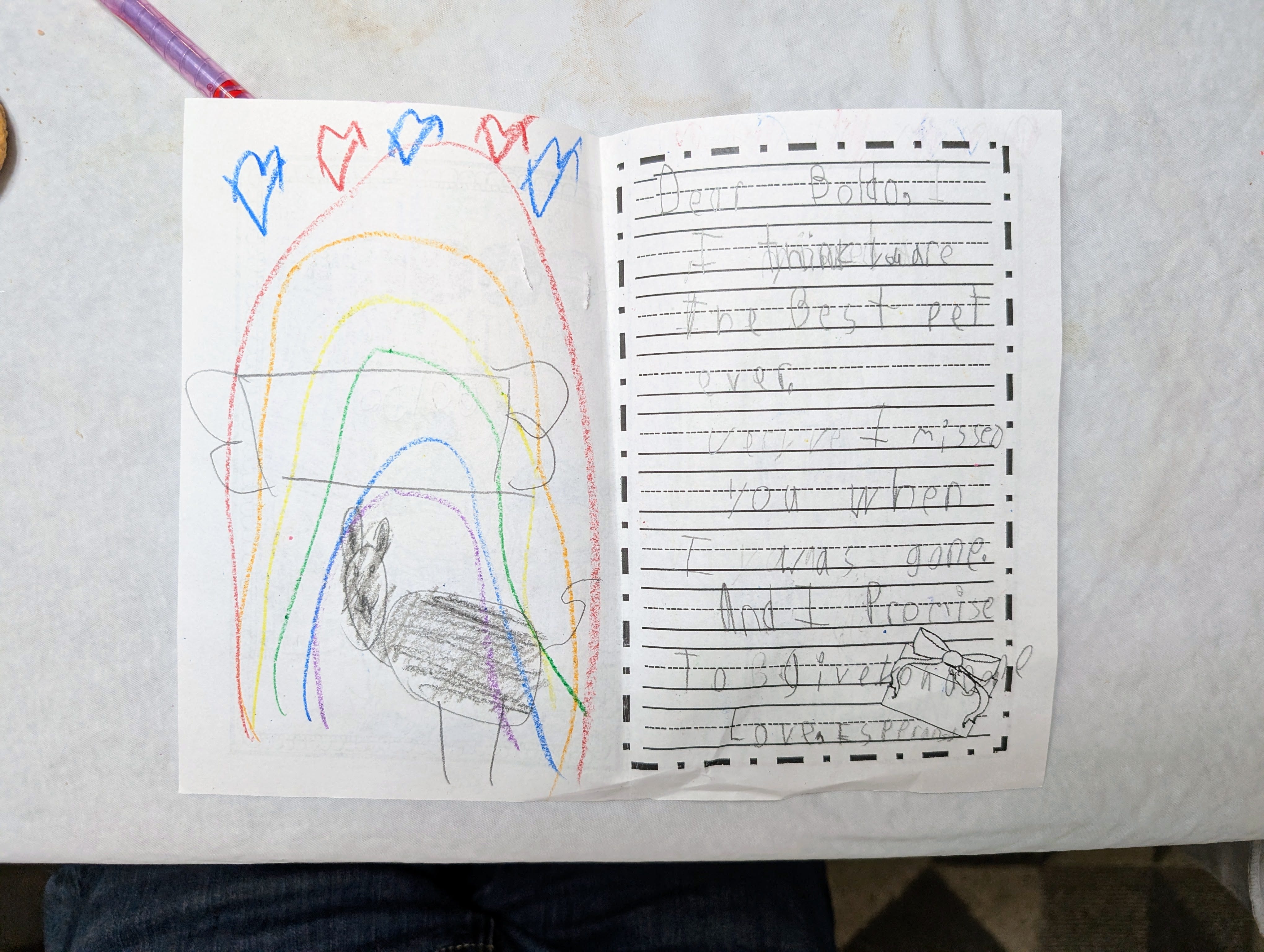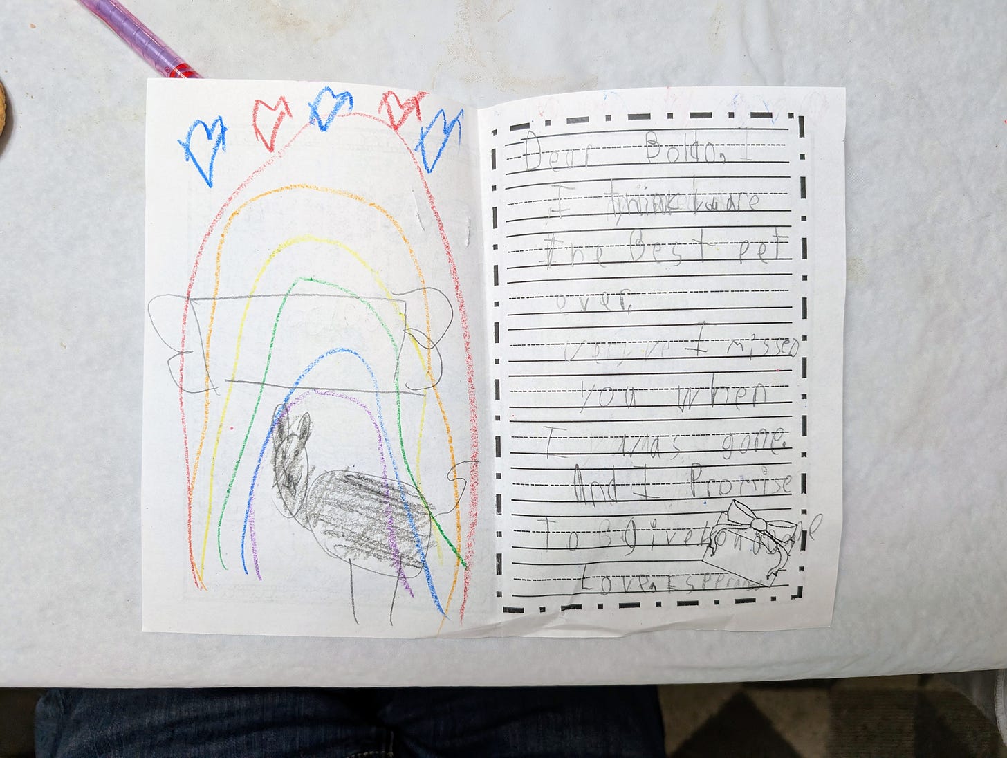 Third, it’s a very beautiful card and she has drawn the dog, a bone and of course a rainbow and hearts - because nothing says Christmas like hearts and rainbow colors.