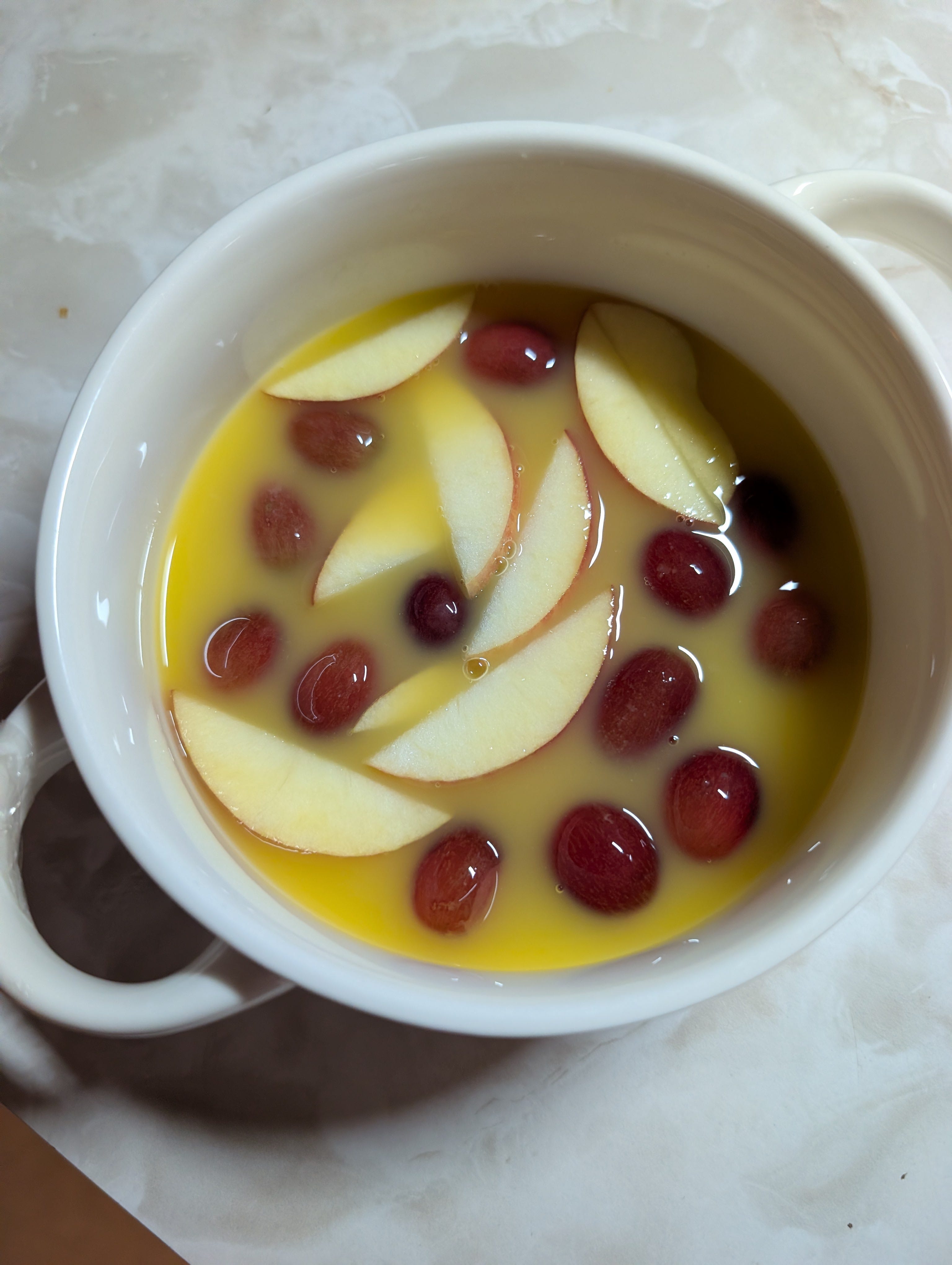She goes to the fridge and finds a handful of grapes that I had in a plastic bag for her snack at school and then pours them into a bowl. She then asks me to cut some apple slices and put them in the bowl. Then, I am to pour some orange juice over them…