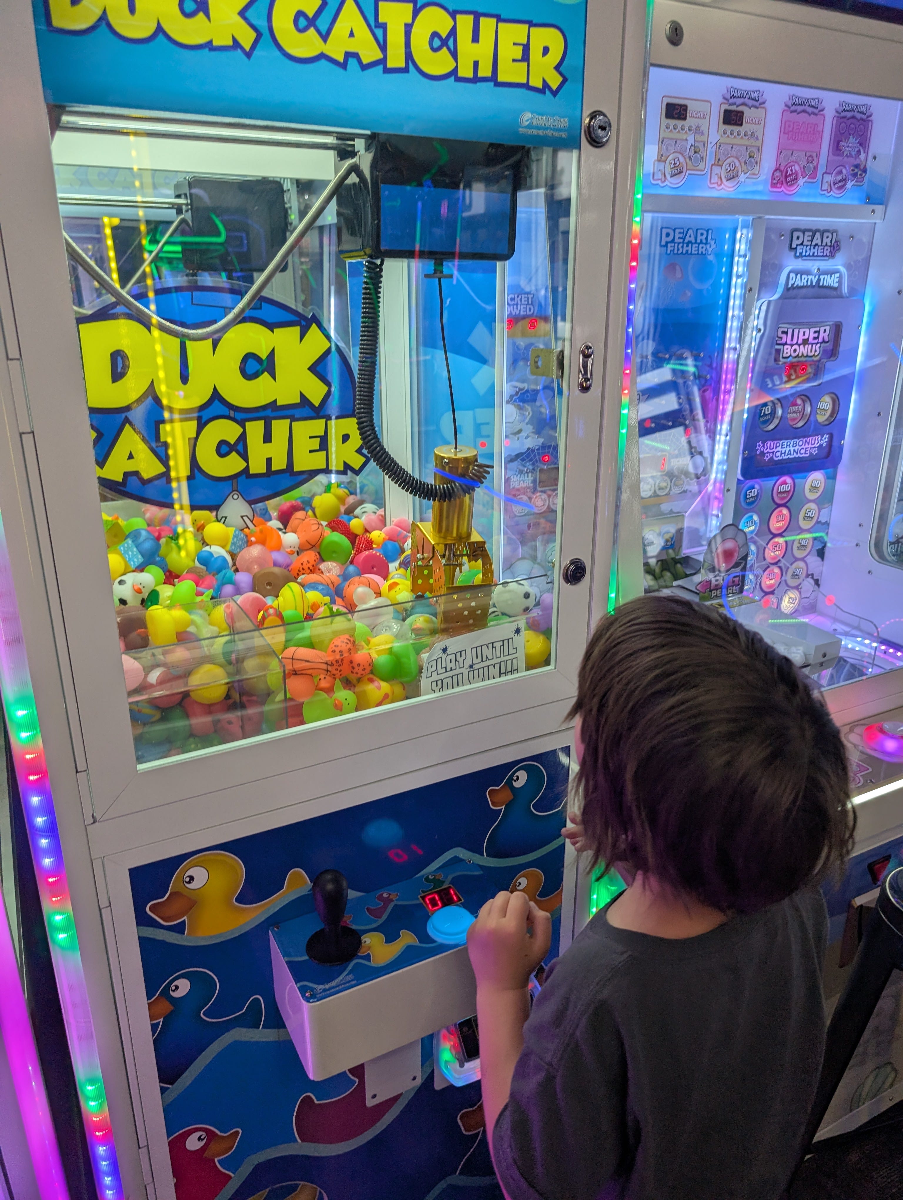 Besides, we’re an expert at claw games because we made our own. It took a few tries but she finally won a rubber duck. In fact, I don’t know if the game was broken or somebody didn’t pick up their prizes but there were five ducks in there so she won the rubber duck lottery today.
