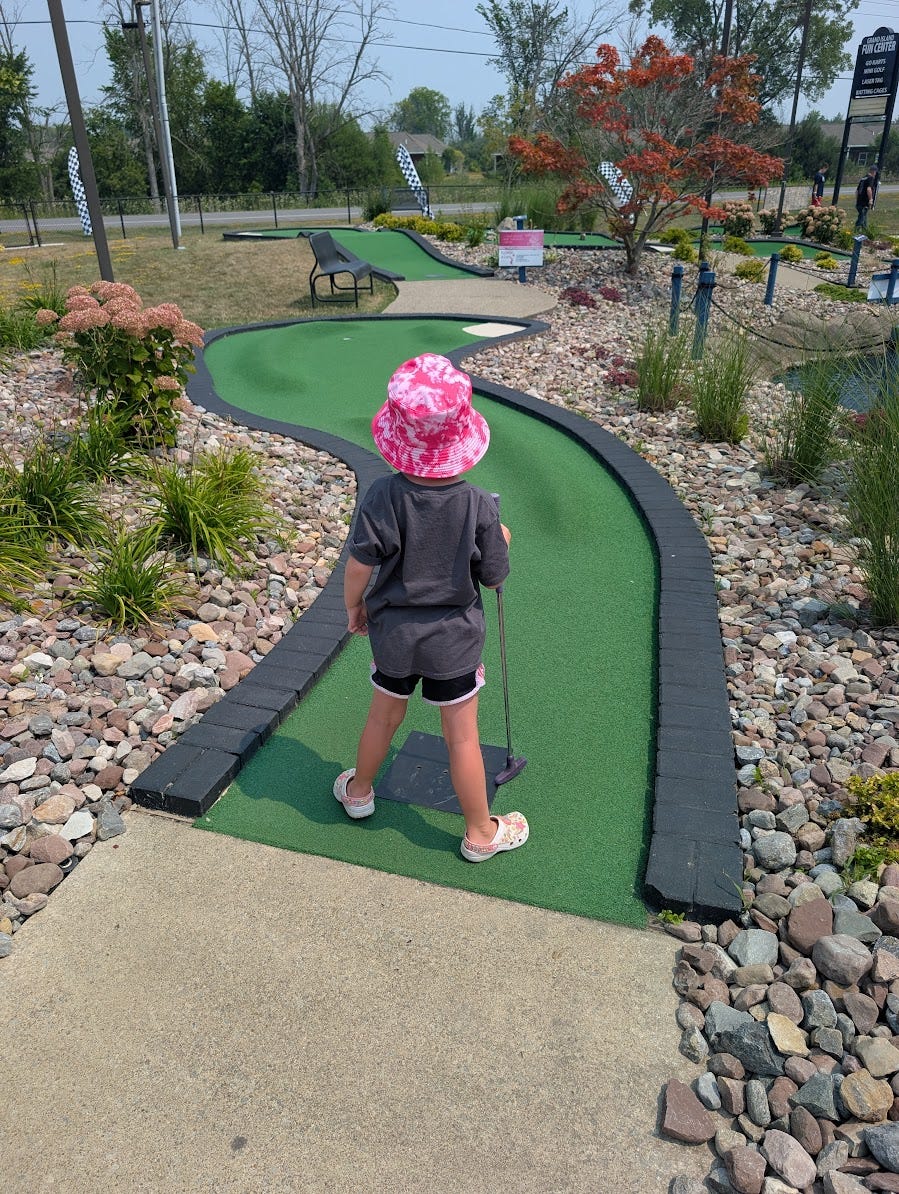 The child and I decided we had to do something after yesterday’s lazy day so BW suggested at lunch that we go to the Grand Island Fun Center for some mini golf and go carting as we had to do something.