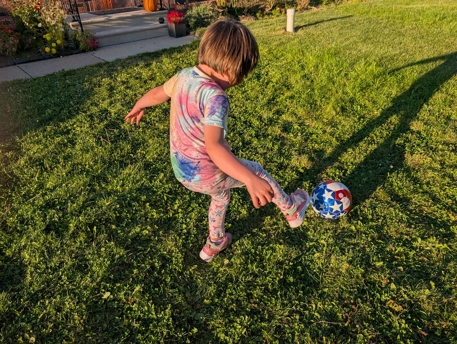 But then I think that she’s getting big so fast and so I pretend to be in a soccer challenge in the middle of the front yard: