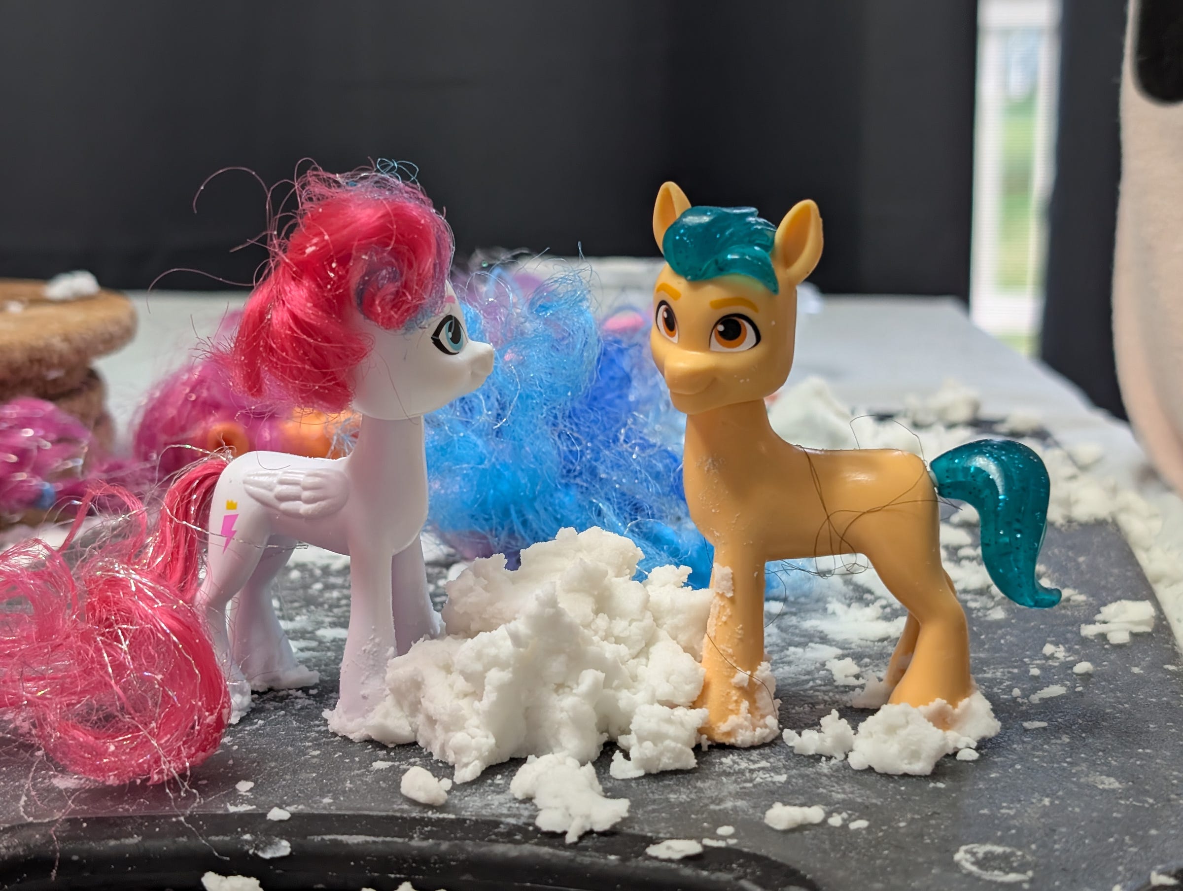 It ended up being about a 3:1 ratio of soda to lotion and worked on our first try. Of course she wanted to play with me so I was given two ponies to compliment her two and we pranced around in the snow I had placed on a cutting board on a kitchen table.