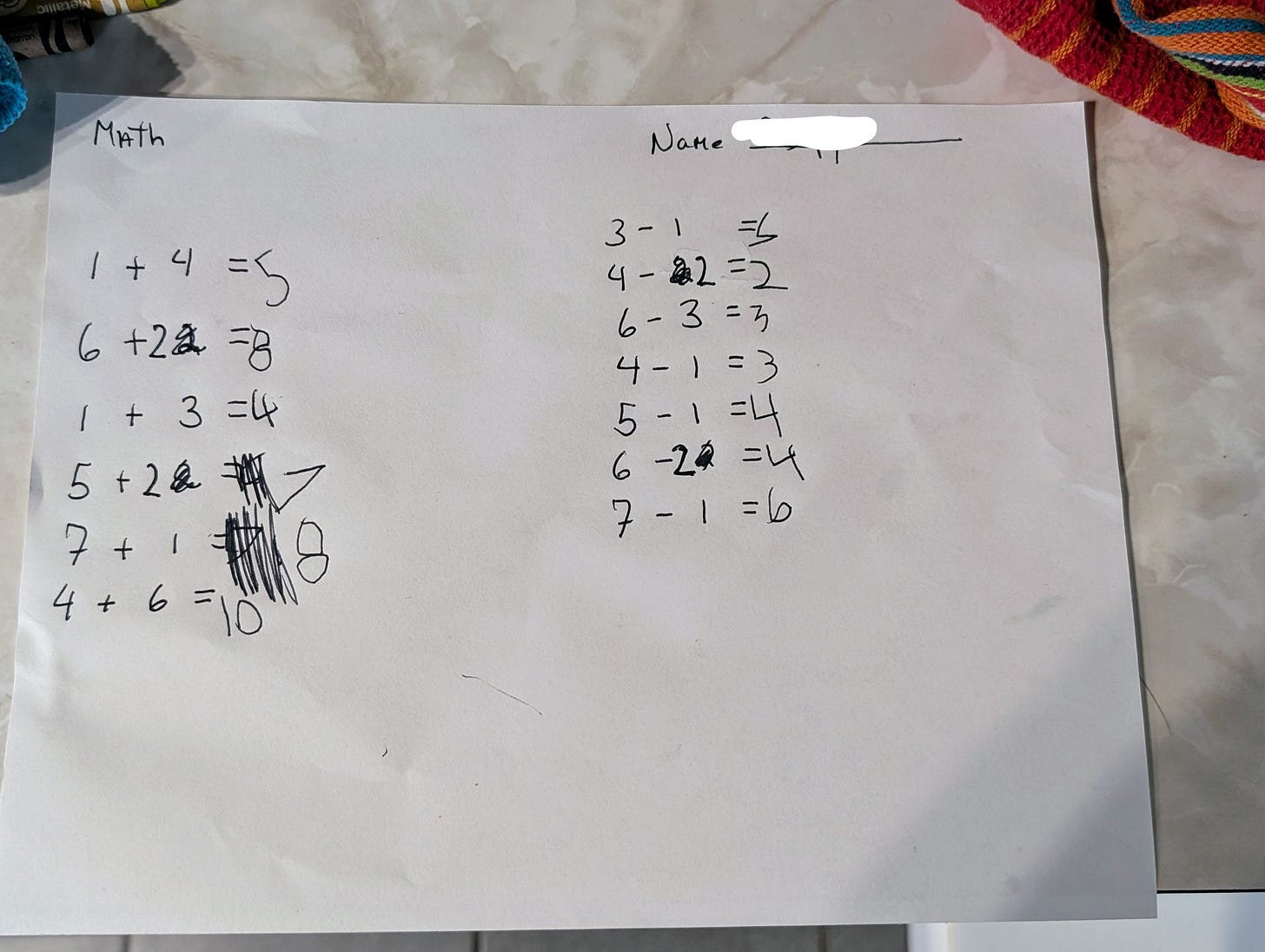 Later we found the “homework” on the kitchen counter. After all the tears and protests she did the homework when we weren’t looking.