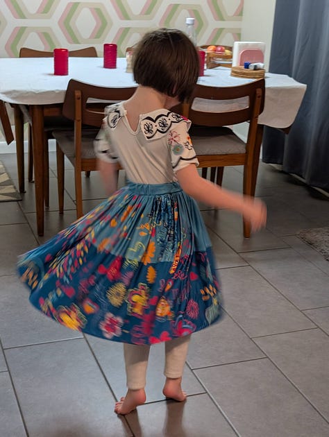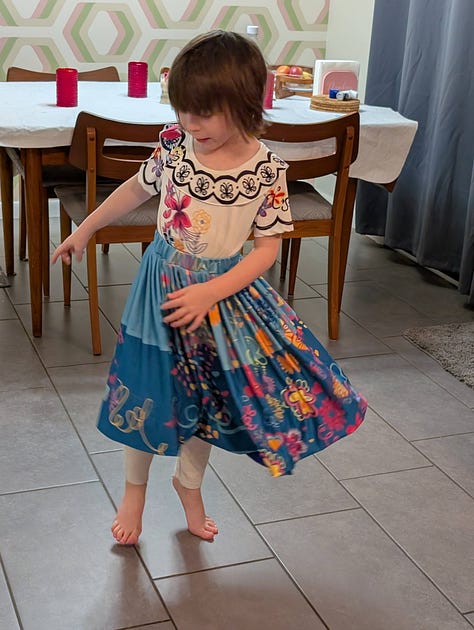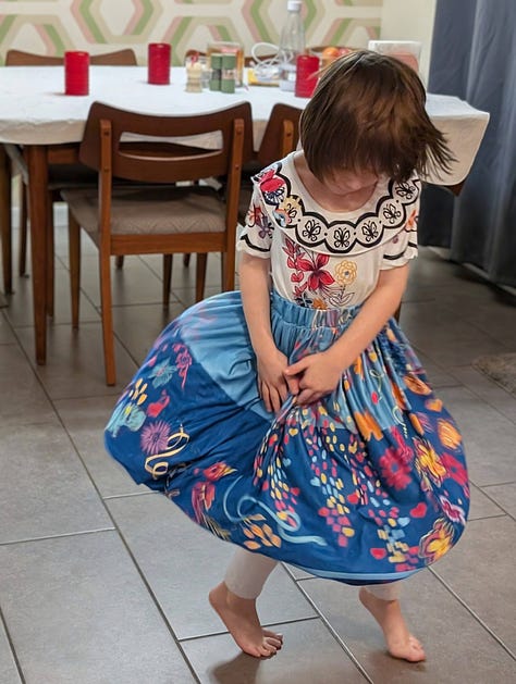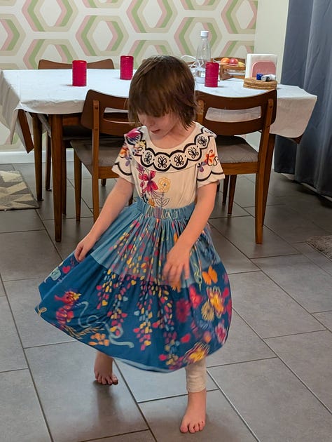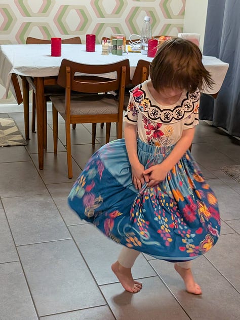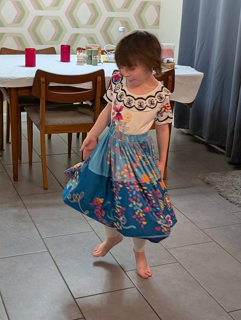 The robot vacuum got stuck on the mat upstairs and so the child decided she had to be on “robot watch” and got dressed into her costume because one cannot watch the robot vacuum without being properly dressed.