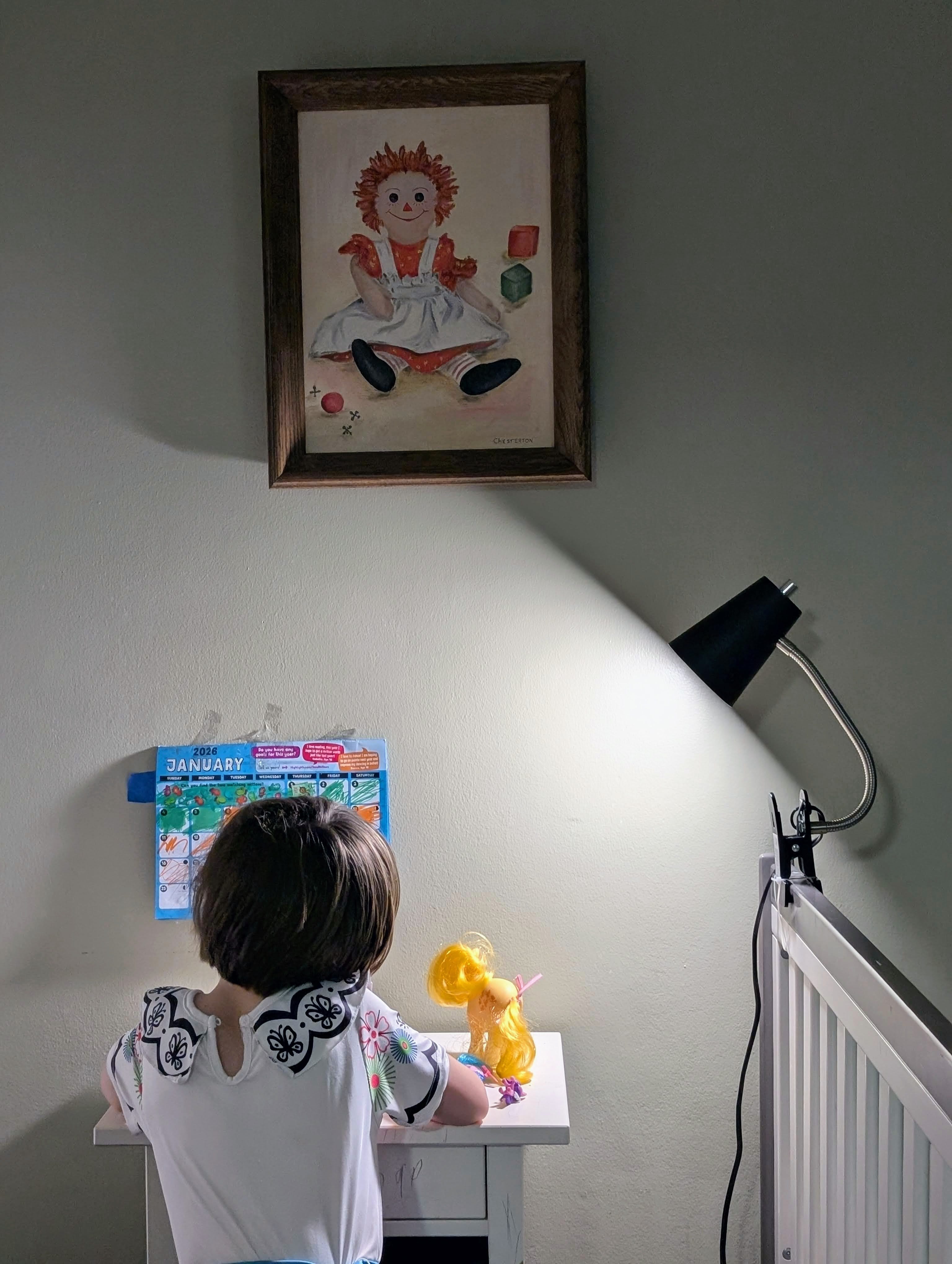 in anticipation for the new dresser we moved a few things around and what was an end table became a “School Desk” for her to write and play as seen in the photo at the top of the page