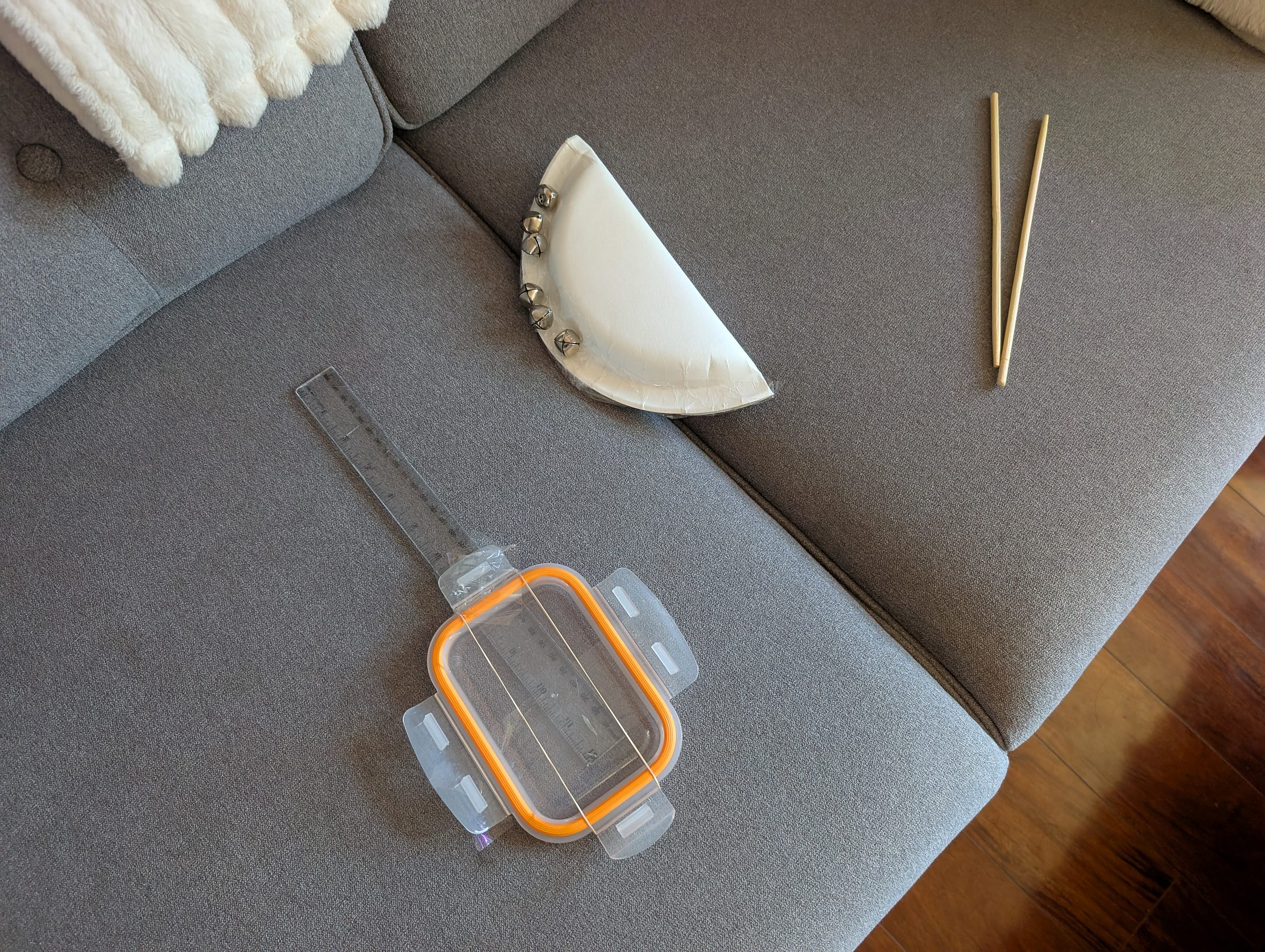 We almost didn’t have a tambourine due to artistic differences. She wanted the bells glued on to the plate but I had no glue that would be safe/stick so I rolled some tape up and stuck the bells on there and it seemed to work. It was touch and go for a minute there as I thought we were going to break up before our first song was sung.