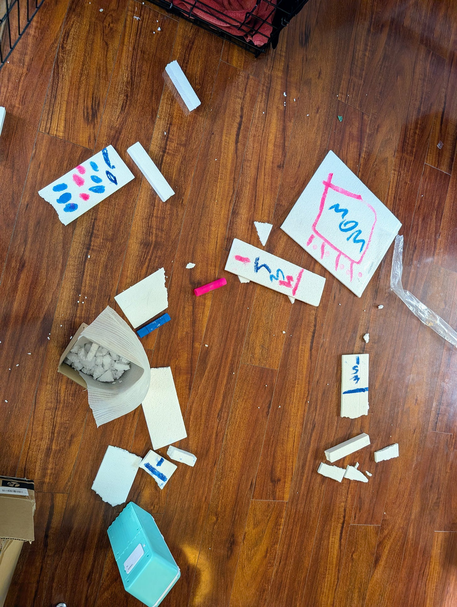 I could not resist crying when I saw the mess downstairs. There was styrofoam in my ball cap, some small boxes and of some of it became art boards for her artwork, which is great - but it’s styrofoam.