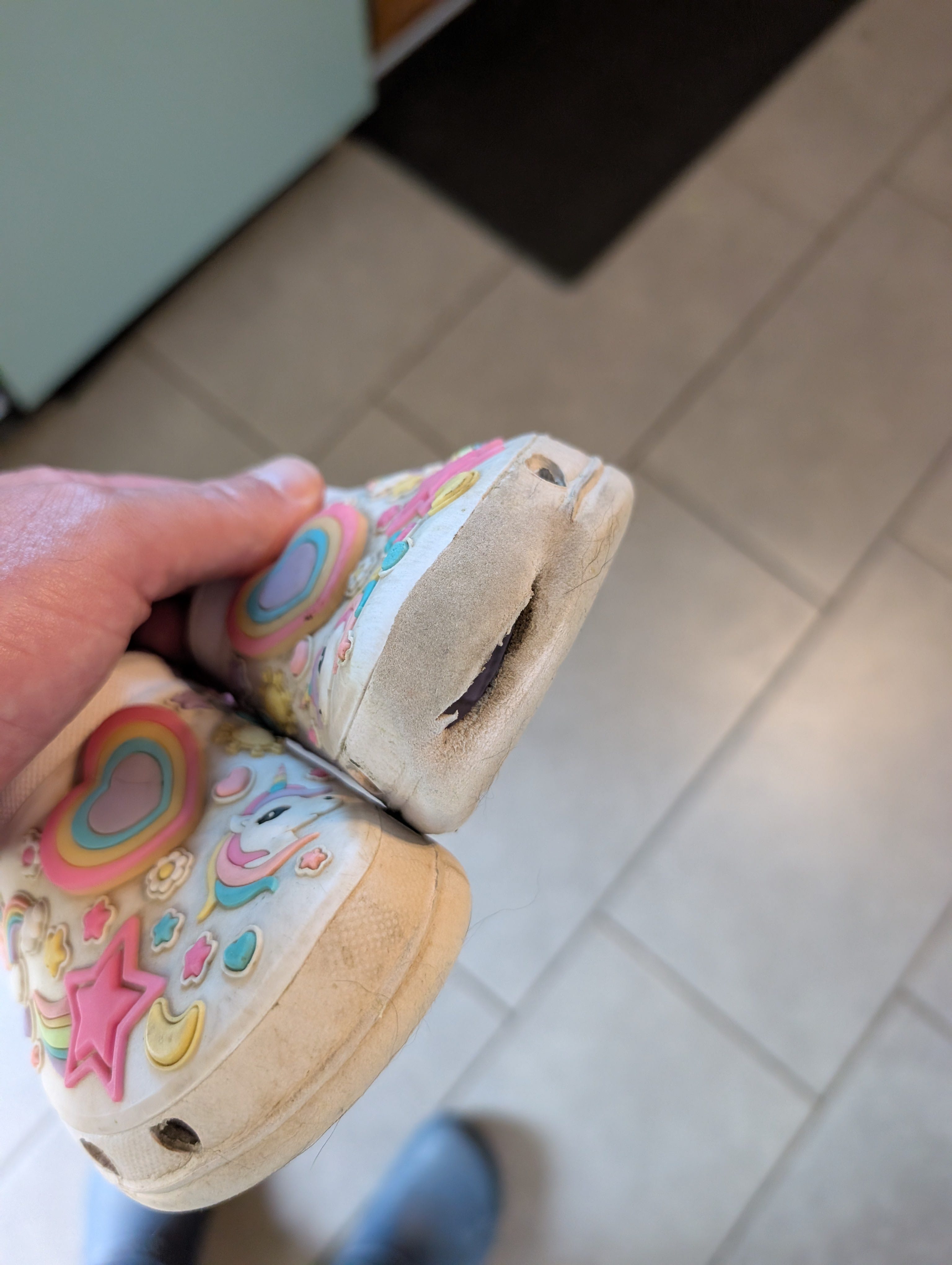 They are worn out because she just drags her toe to stop her scooter and after a summer of scooting, there’s not much left of these.