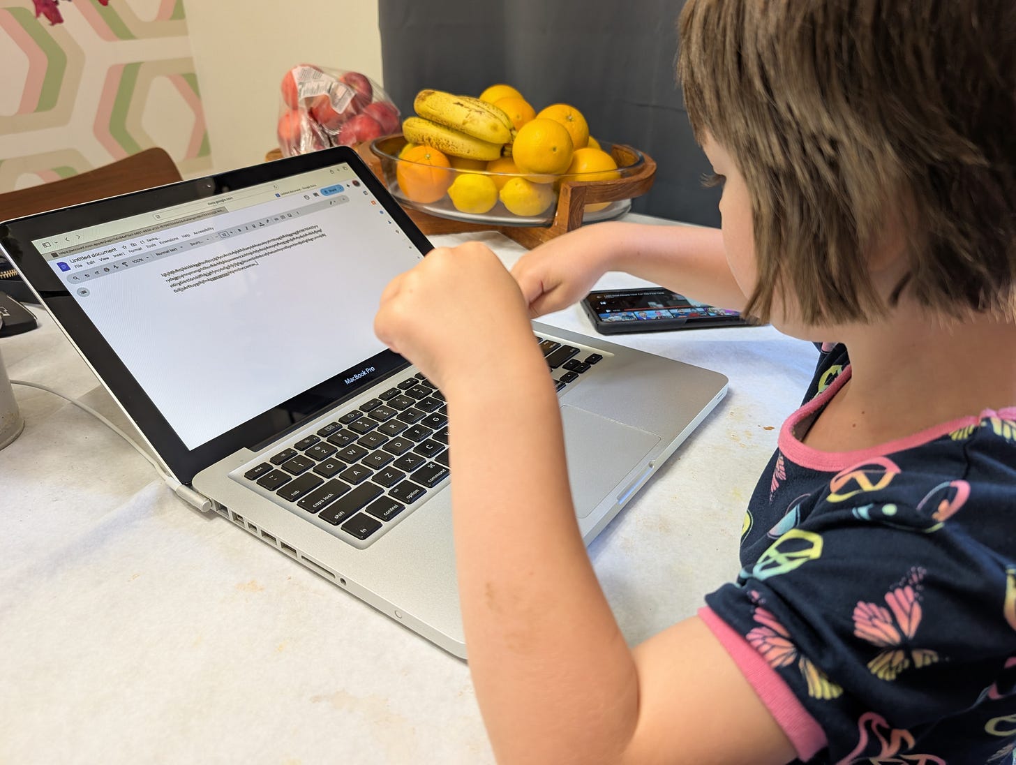 Earlier this morning I was at the computer and she told me she wanted to write a book on a computer too. So, I grabbed an old ancient mac that takes like 20 minutes to start up and fired up google docs and let her go to town: