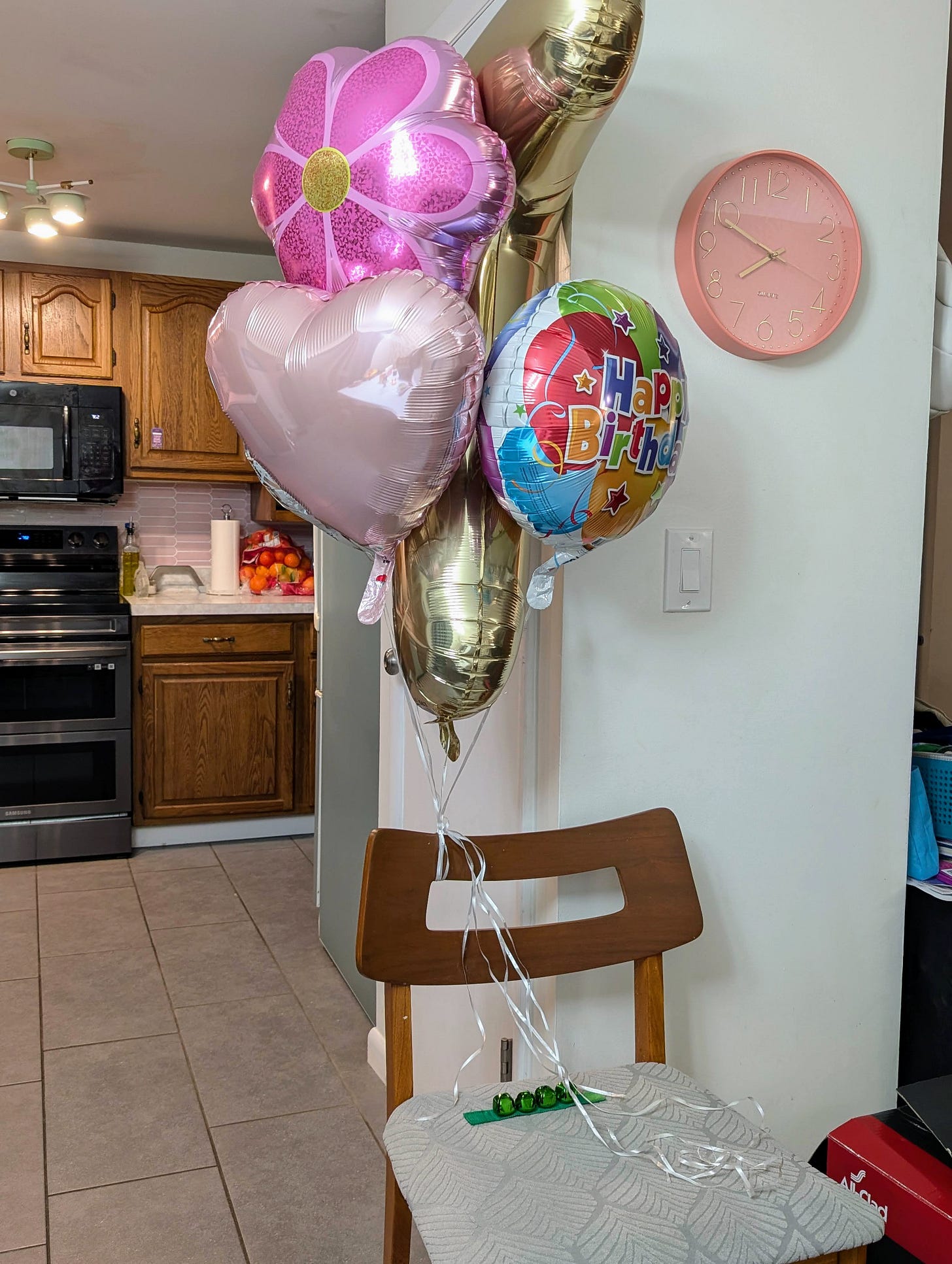 She figured that a big bouquet of balloons would be hard to miss in the kitchen and for good measure she left the jingle bell bracelet of hers. Santa, if you’re reading - the Christmas birthday gifts go here.