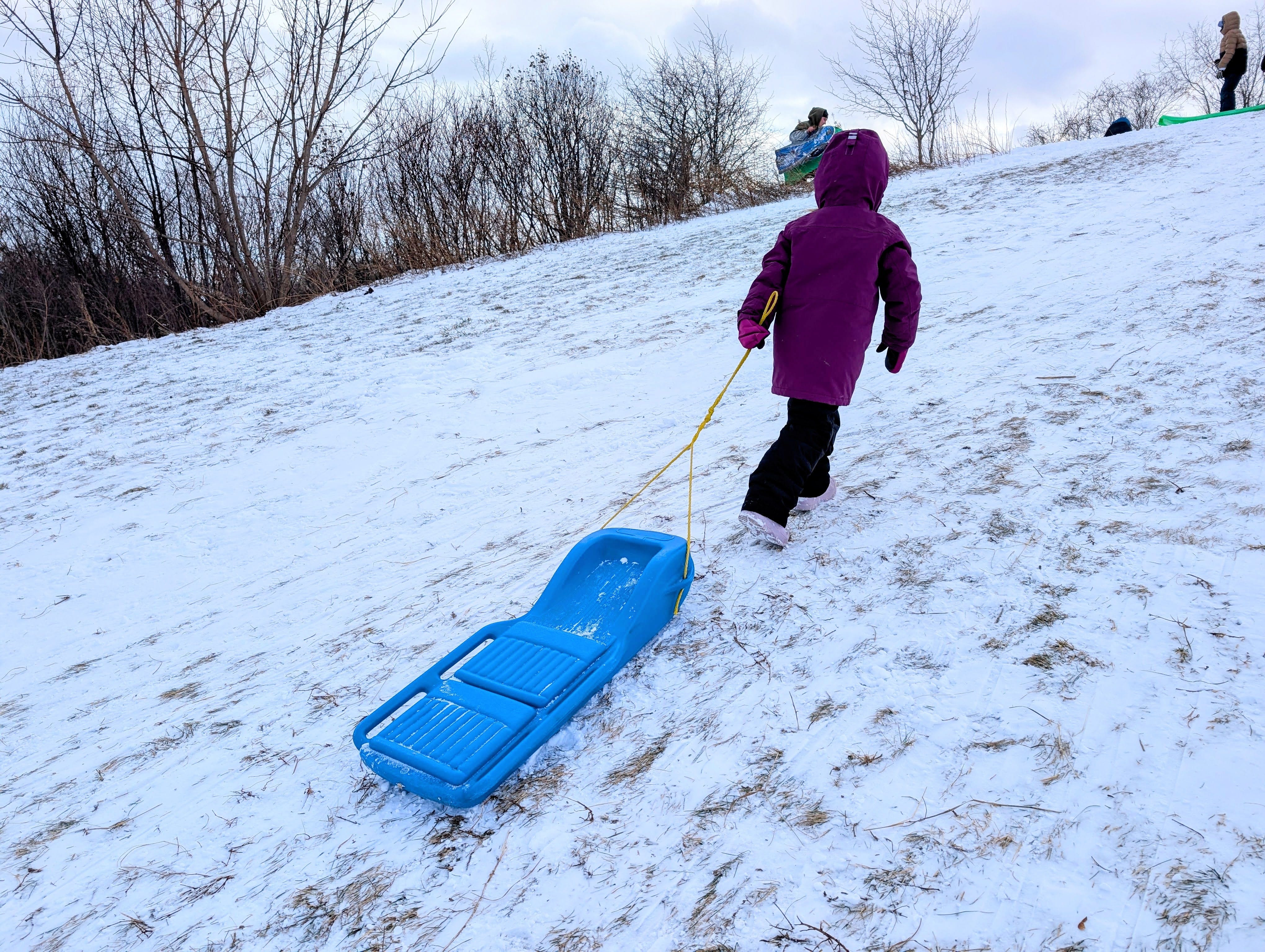 I tell her that the sledding rule is you drag your own sled up the hill. I’m no snowplow parent and she can pull her own sled.