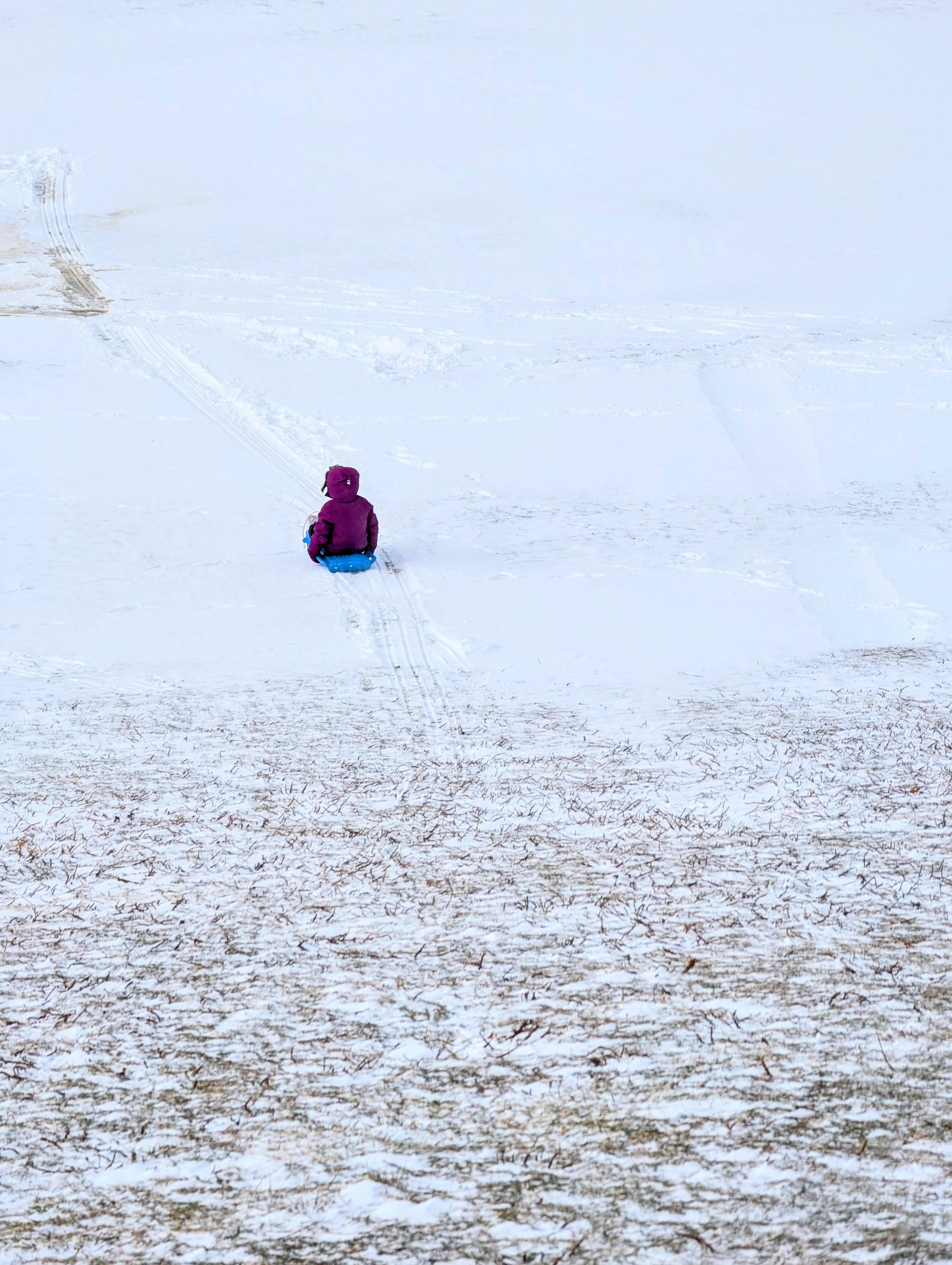 We get there and there’s a few other families breaking all the rules and we realize that due to this and the lack of snowfall there’s very little snow on the hill itself. This actually turned into a good thing for our solo sledding because the grass lumps poking through put the brakes on.