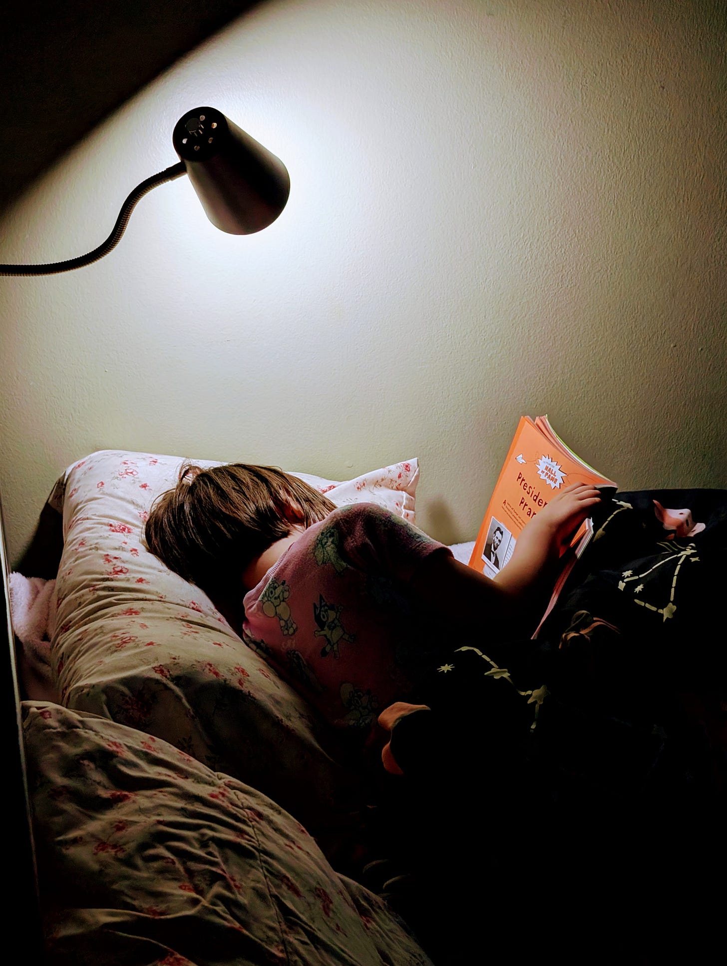 But as an attempt to accelerate this plan and get her to stay in the bed, I found a reading light in the basement and plugged it in so she can read herself to sleep.
