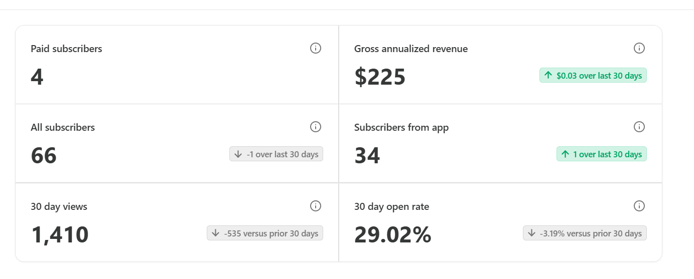 Thanks to a relative who upgraded their subscription to a founding member status, this brings my annual income from this newsletter to $225.00